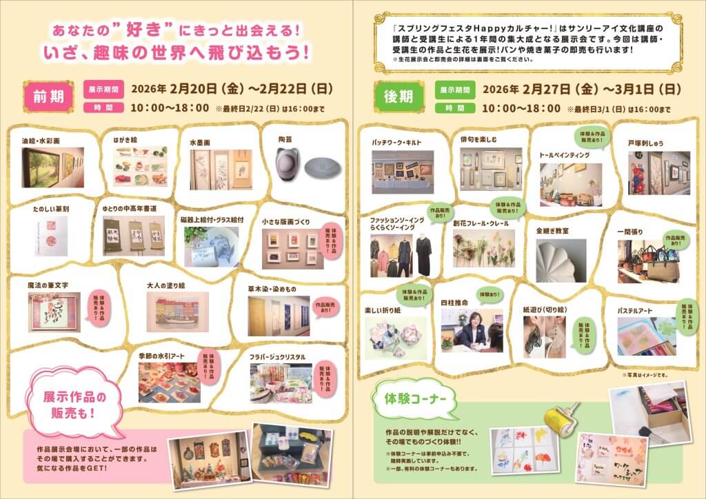 年に一度のカルチャーの祭典!サンリーアイ文化講座講師と受講生の皆さんが1年間の学びの成果を発表します。今回は作品展示会と生花展示会を開催します。皆様のご来場を心よりお待ちしております。