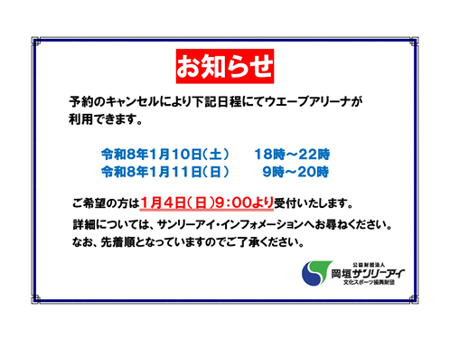 【ウエーブアリーナ追加予約受付のお知らせ】
