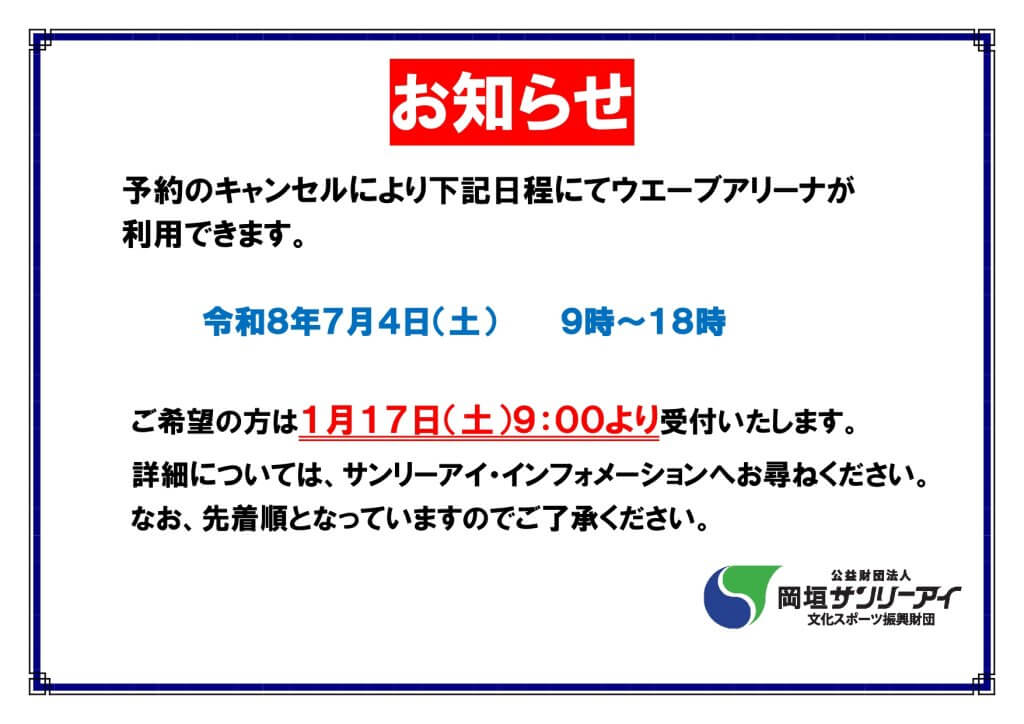 【ウエーブアリーナ追加予約受付のお知らせ】